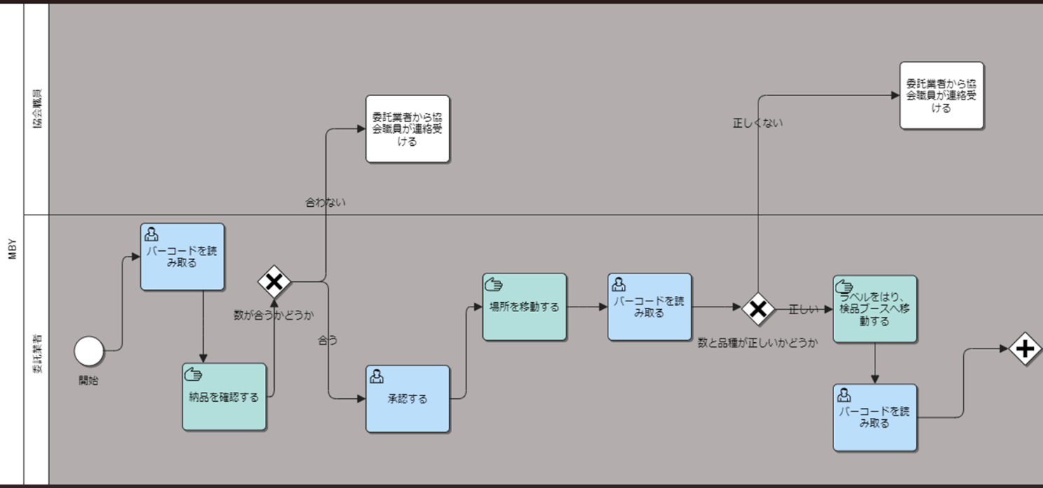 システム化の事前作業として、システムの目的と機能を明確にする要件定義が必要です。そこで、体験実習生には、新しく導入しようと考えているシステムを用いた業務プロセスがどのようになるのか、一連の植物管理の工程をBPMN(ビジネスプロセスモデリング表記法)というビジネスプロセスの全体像を可視化するための図を作成してもらいました。