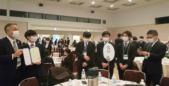 表彰式では、参加企業と入賞76チームの学生が一同に会し、入賞チームの発表とインタビュー、表彰状・賞金授与、企業と学生の懇談会、代表3チームによるプレゼンテーションが行われました。